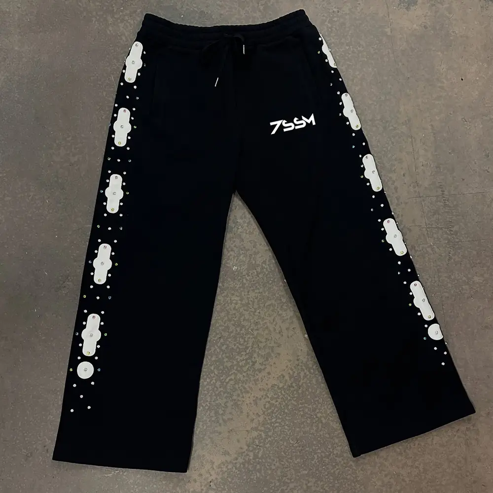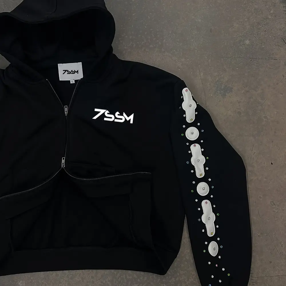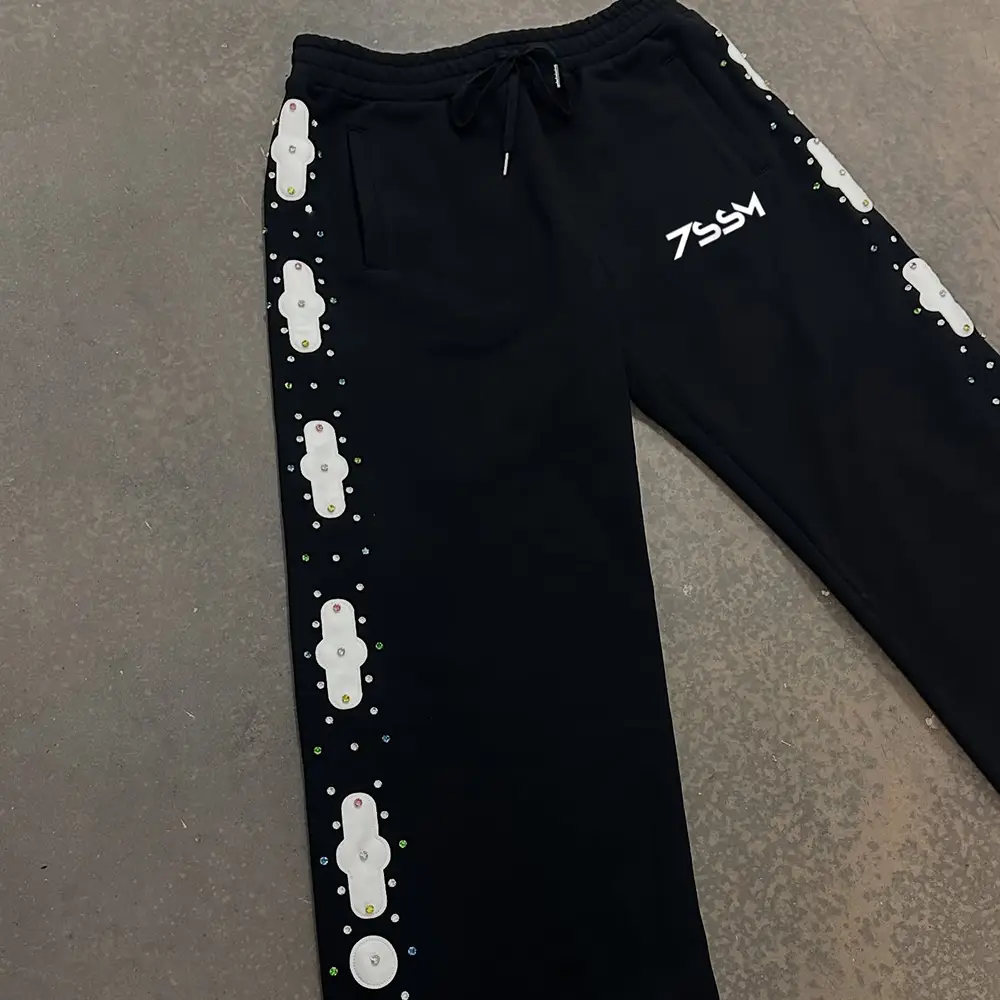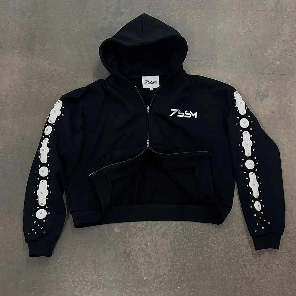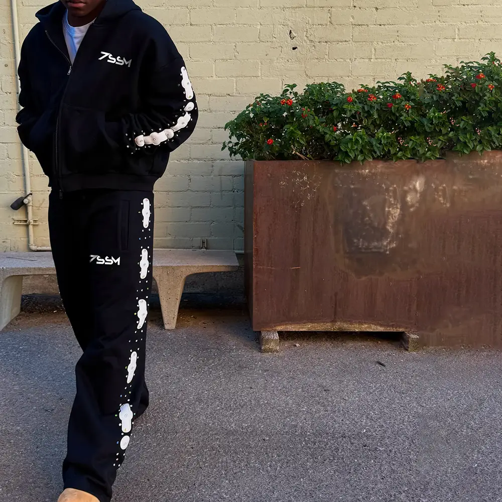 Custom Men's Winter Streetwear Oversized Sweatpants Double Zip Hoodie Set Rhinestone Patch Joggers Embroidered Sweat Suit