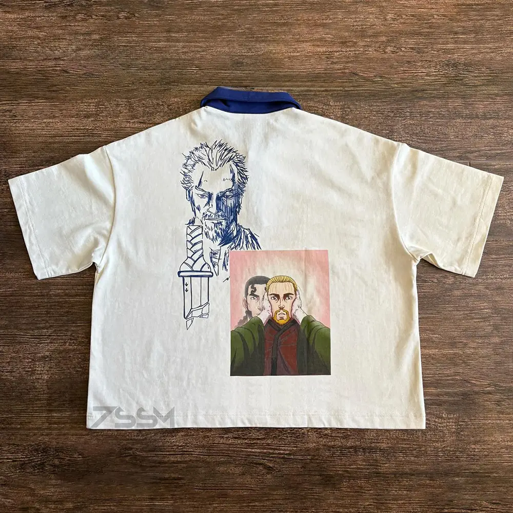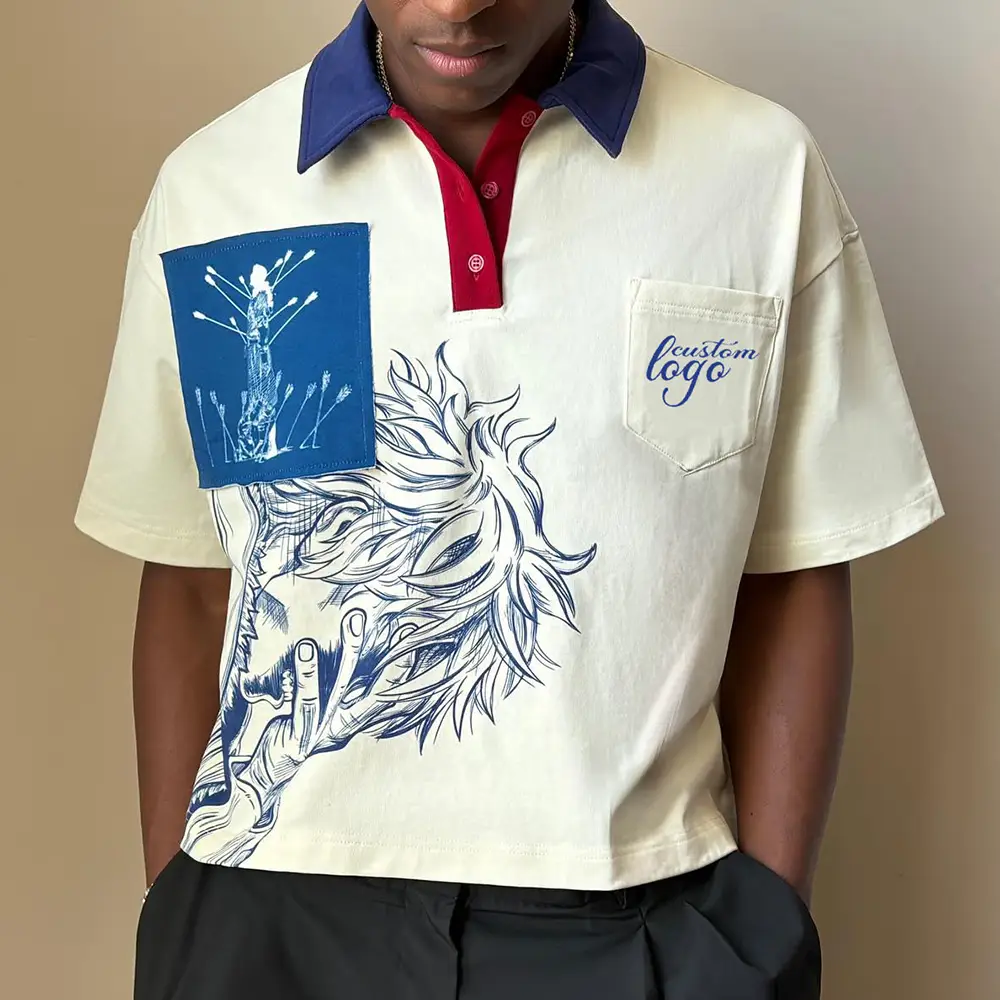 Streetwear Custom 100% Pure Combed Cotton Dtg Print t Shirt Turn Down Neck Button Oversized Graphic Short Sleeve Polo Shirt
