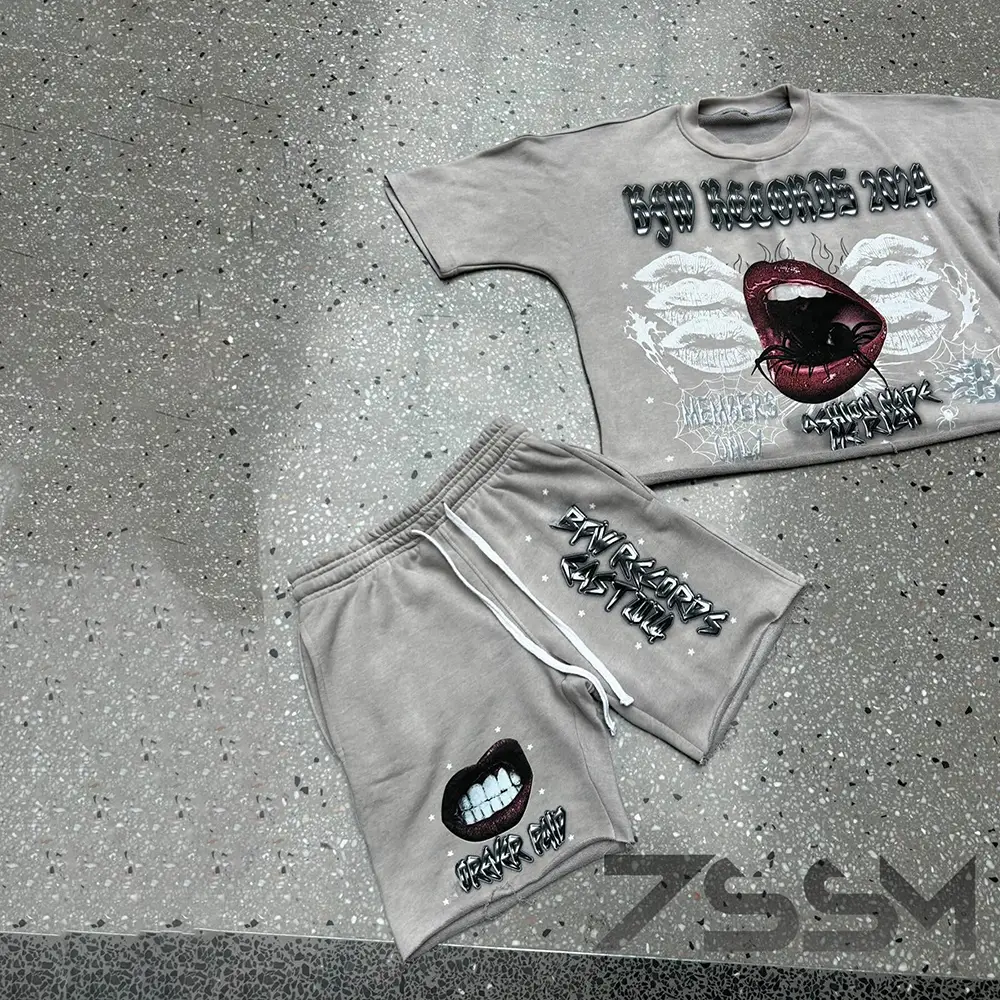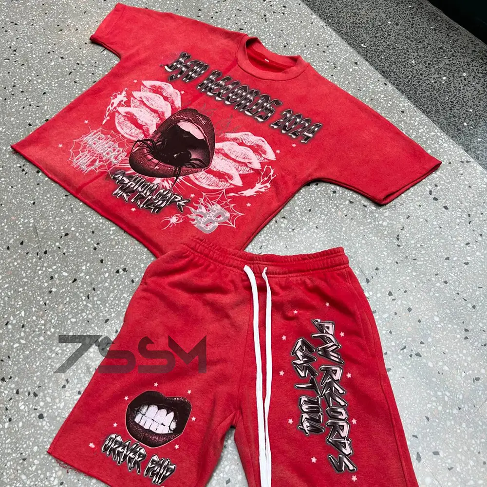 OEM Custom Acid Wash Boxy DTG Print Vintage Cropped T Shirts Short Sleeve Tshirt Shorts Set Men's Streetwear Hip Hop Summer