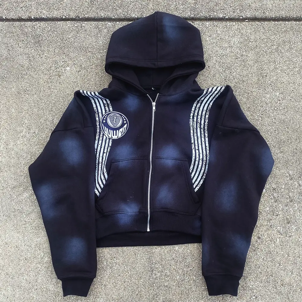 Custom Men's Outerwear Sets Cotton Baggy Cropped Boxy Side Stripe Applique Embroidery Acid Wash Zip Hoodies Sweat Pants
