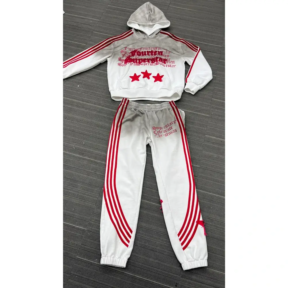 Men's Custom Flared Sweatpants Hoodie Set Streetwear Acid Wash Side Stripe Jogger Zip-up Breathable Applique Embroidery Patch
