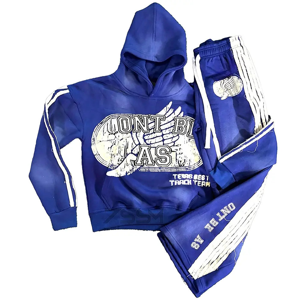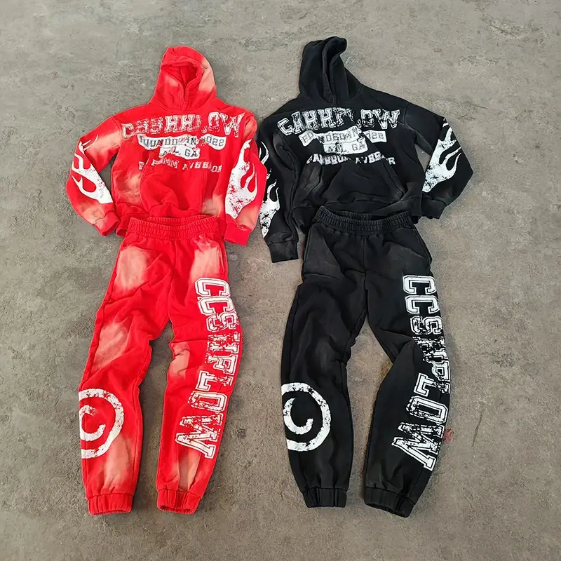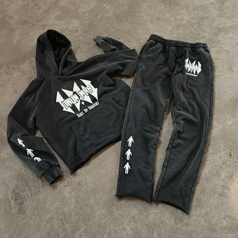 Custom Men Hoodies and Sweat Pants Set Acid Wash Tech Fleece Tracksuit Distressed Embroidery Flared Sweatpants and Hoodie Set