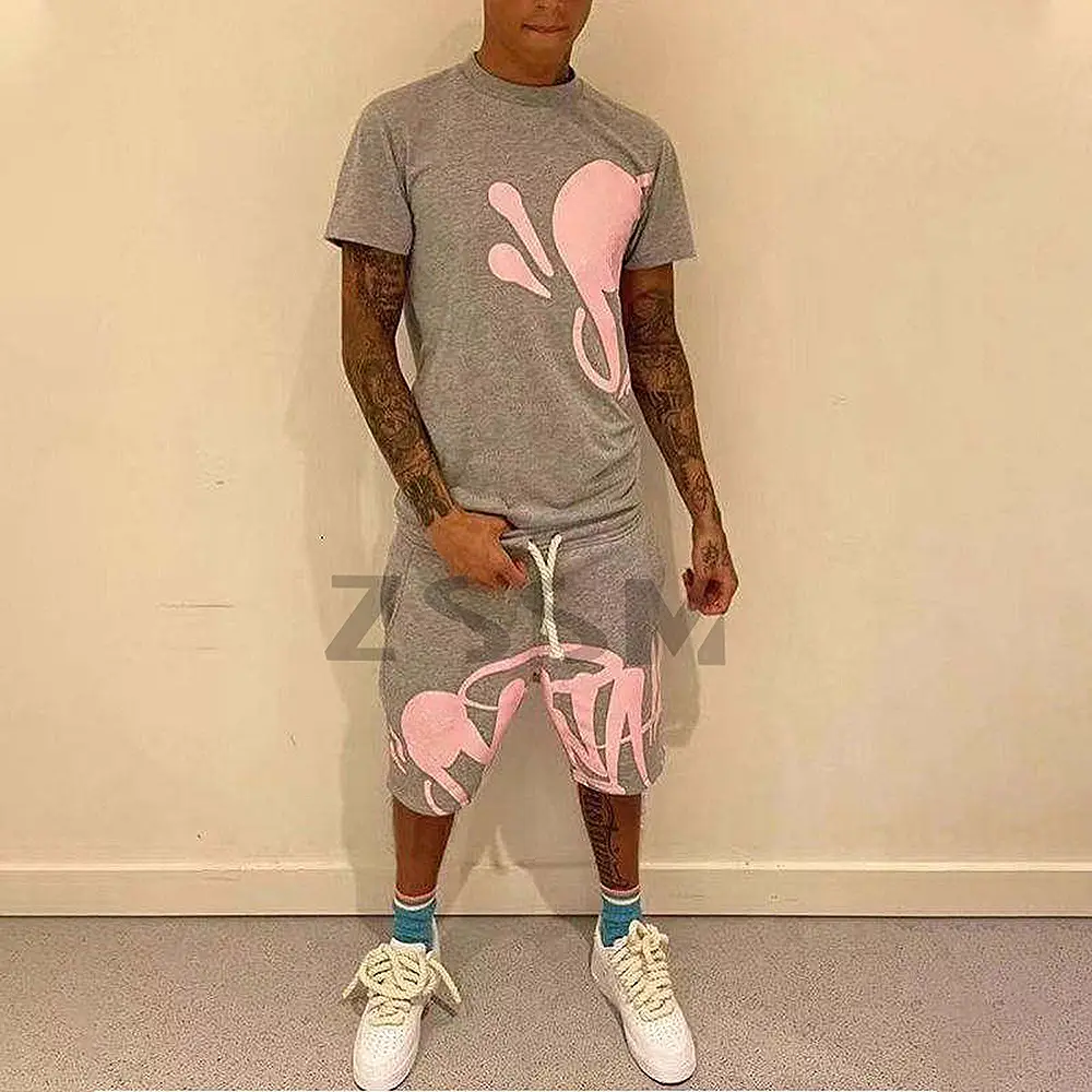 Custom Logo High Quality Summer Fashion 100% Cotton Men's Oversized Two-Piece Casual Shorts Set Printed Pattern