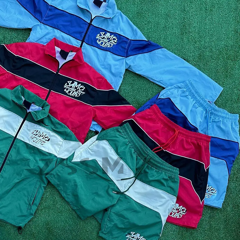 Custom Two Piece Splice Short Jacket Set Zip up Jacket Sweatsuit and Nylon Sweat Pants Shorts Tracksuit for Men