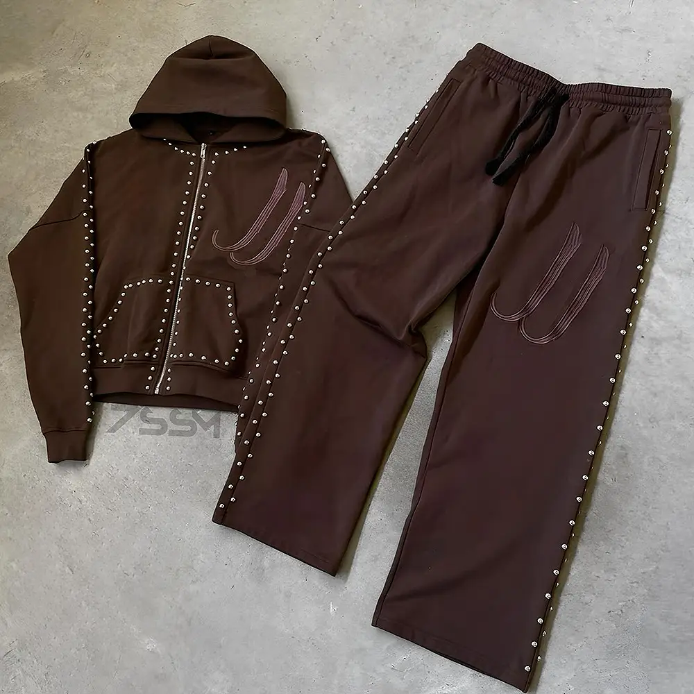 Men's Heavyweight Cotton Zip-Up Hoodie Sweatpants Set Custom Embroidered Logo and Rivet Design Breathable Winter Tracksuits